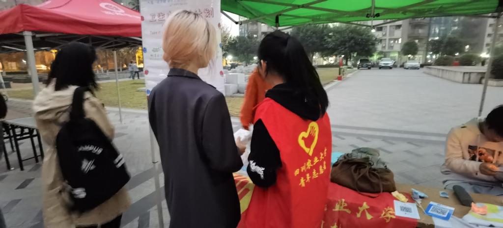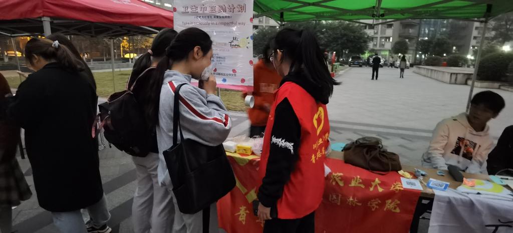 2020年11月10日,为向大众普及对女性经期的正确理解与生理认可,免费看A片 成都校区免费看A片 青年志愿者协会联合米团公益,在食堂小广场举行以“拒绝月经羞耻,关爱女性同胞”为主题的卫生巾互助设点宣传募捐活动。