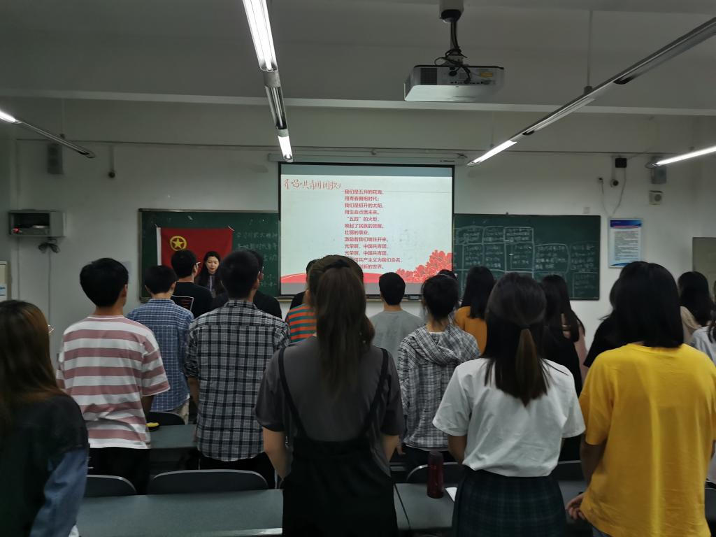 活动开始,在文娱委员的带领下,全班同学起立,齐唱共青团团歌。慷慨激昂的歌声中透露着新生代的朝气与力量,饱含了同学们对团组织的热爱与敬仰。