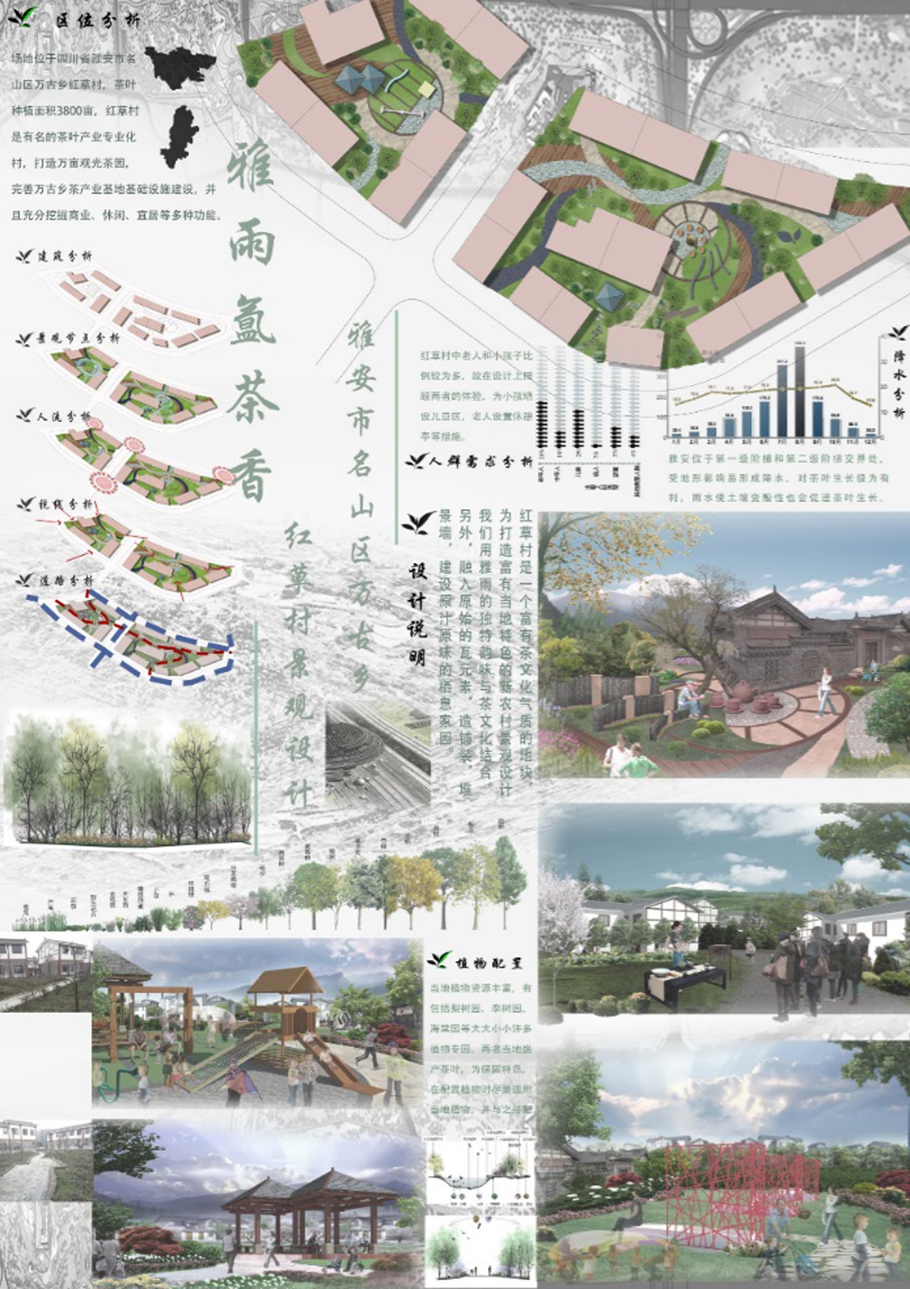 雅安是茶文化名城古都,红草村又盛产茶叶,又有三雅之特色,成员将设计主题定为“雅雨氲茶香”。在景观小品的样式设计中,充分加入茶叶的元素,既美观又很有独到的韵味。为便利村民,设计更加注重开放性,将建设四通八达的空间为目标.尊重生态,因地制宜,通过对场地现状和使用者人群的分析,规划园地有以下几个功能:第一,为方便村民体育锻炼需要,设计以体育活动场地、器械等来满足康体休闲活动的需要。第二,在设计中加入综合性活动区域,提供观景展览、餐饮、喝茶、晨练等活动的场所和设施。